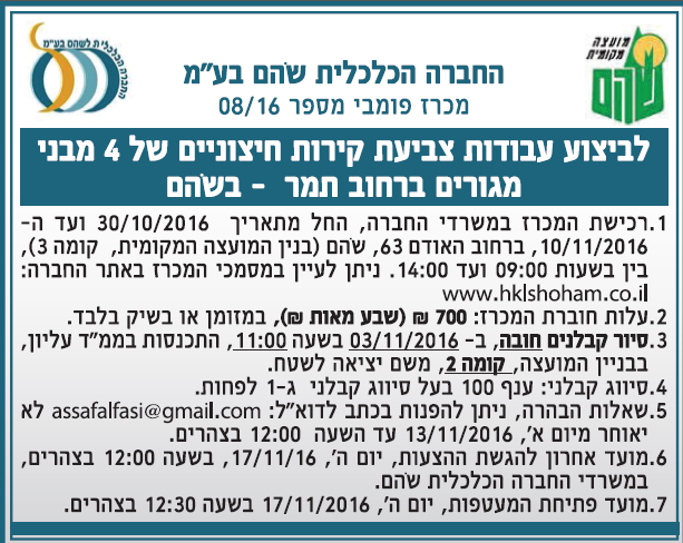 החברה הכלכלית שֹהם בע"מ - מכרז פומבי מספר 08/16 |