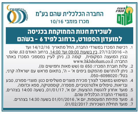 מכרז 10/16 - לשכירת חנות בכניסה למועדון הספורט שוהם