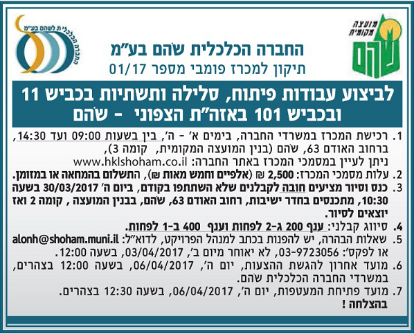 מועד הגשת המכרז נדחה מיום רביעי, 29/3/17 בשעה 17:00 ליום חמישי, 6/4/17 בשעה 12:00