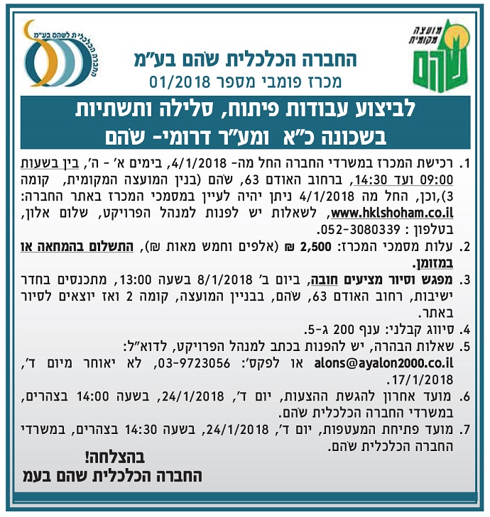 החברה הכלכלית שֹהם בע"מ - מכרז פומבי 01/2018 |