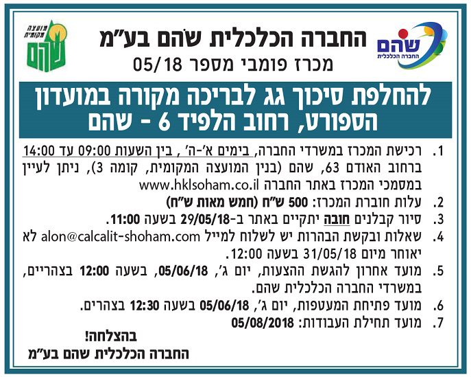 החברה הכלכלית שוהם בע"מ - מכרז פומבי מספר 05/18 |