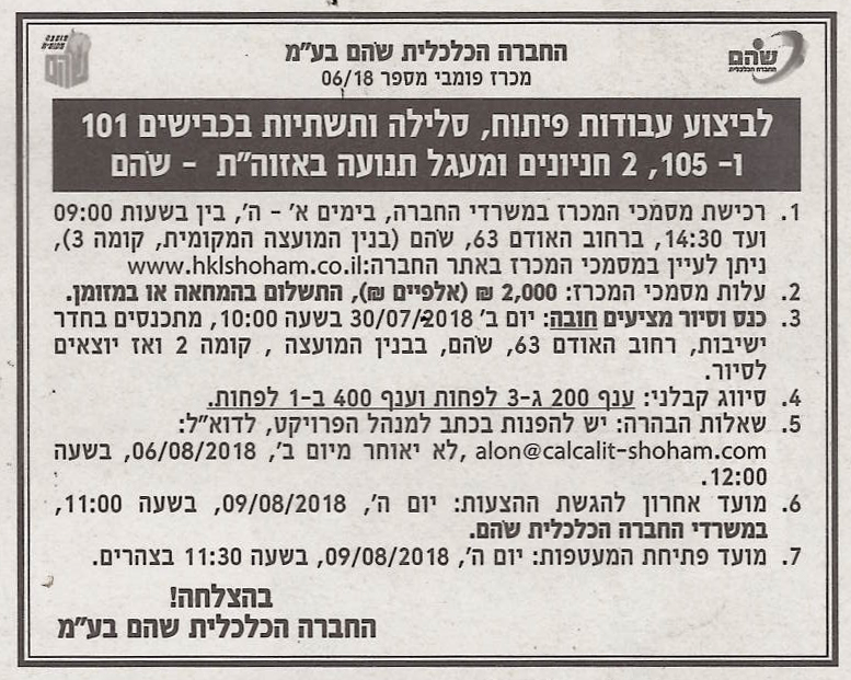 החברה הכלכלית שוהם בע"מ - מכרז פומבי מס' 06/18