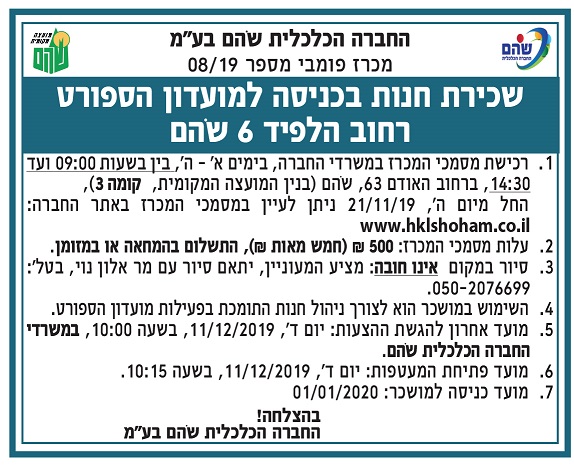 זוכה במכרז 08/19 - לשכירת חנות במועדון הספורט: מוניות שוהם דמי שכירות חודשיים בגובה 1,800 ₪ + מע"מ