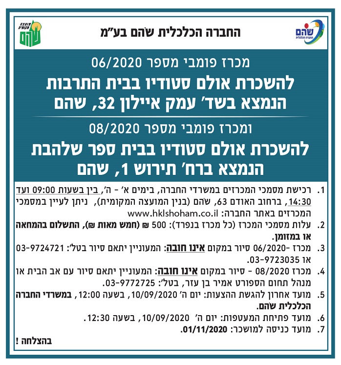 החברה הכלכלית שֹהם בע"מ מכרז פומבי 08/20