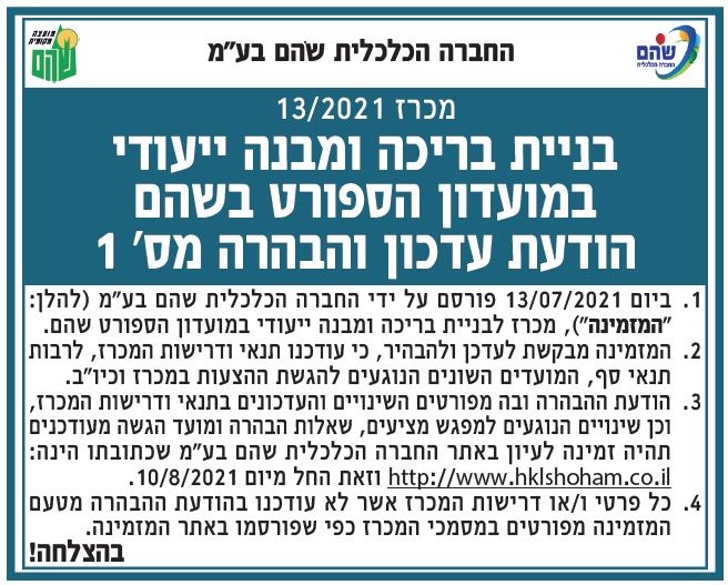 החברה הכלכלית שוהם בע"מ - מכרז מס' 13/2021 |