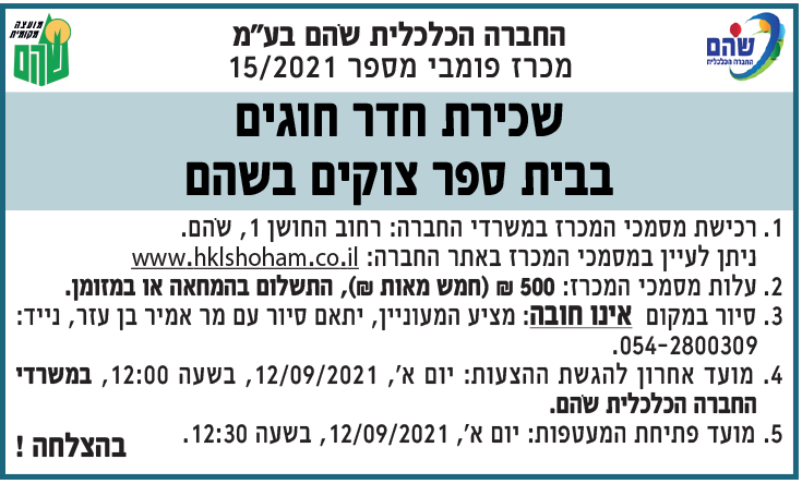 החברה הכלכלית שוהם בע"מ - מכרז פומבי 15/2021 |
