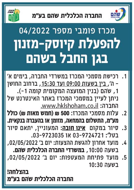 החברה הכלכלית שוהם בע"מ - מכרז פומבי 04/2022 |