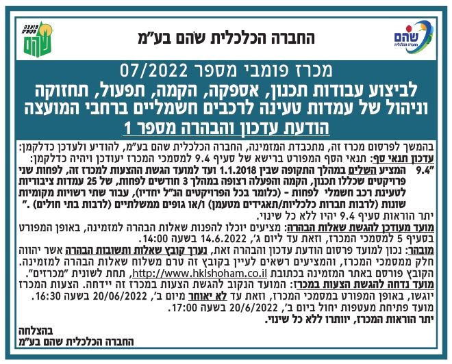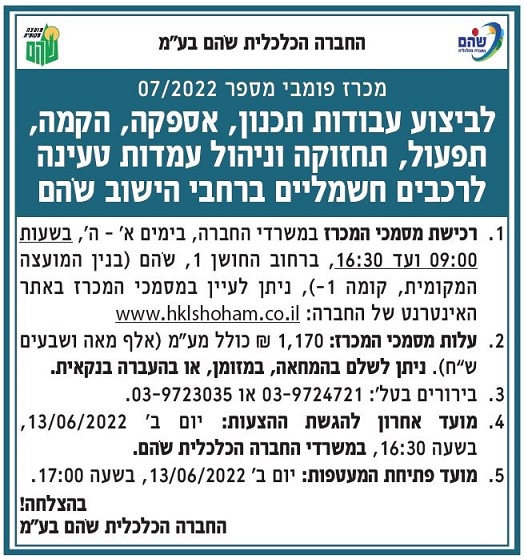 החברה הכלכלית שוהם בע"מ - מכרז פומבי 07/2022 |
