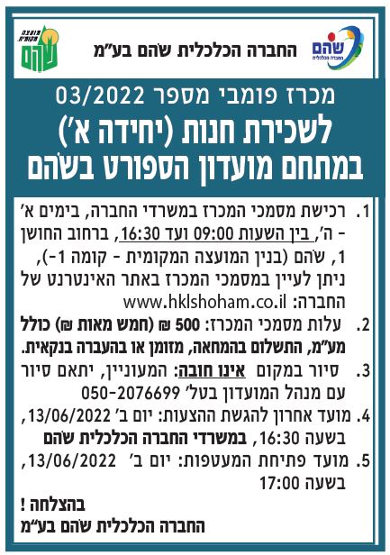 מכרז 03.2022 לשכירת חנות במועדון הספורט בשהם